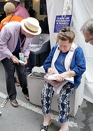 RIGHT: Maxine Gordon talked about her book, Sophisticated Giant, about her late husband Dexter Gordon in the Talk Tent. She was interviewed by another author, Mark Stryker who is shown here (left) outside the Talk Tent. Stryker also gave a presentation about his Jazz From Detroit, just published by the University of Michigan Press.