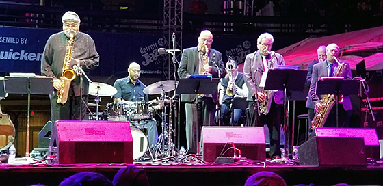 TOP: The Amphitheatre at Hart Plaza featured tenorist Joe Lovano and his Nonet on Saturday night, shown here from left are Lovano, drummer Otis Brown III, altoist Steve Slagle, tenorist Ralph Lalama , and baritonist Gary Smulyan. The classical bop oriented repertoire included pieces by Lovano and fellow Clevelander Tadd Dameron and was delivered with particular gusto by Lovano and Slagle.