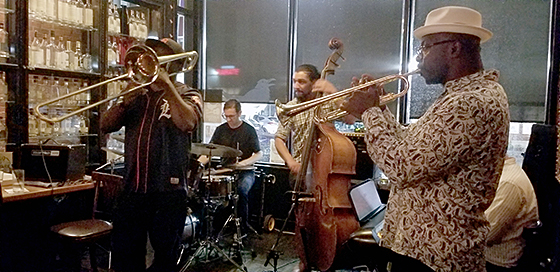 The Ravens Club on Main Street in Arbor presents jazz a few nights per week. On Sunday August 25 pianist Mike Mallis (hidden on the right) invited trombonist Vincent Chandler and trumpeter Dwight Adams to join the house trio (which included bassist Josef Deas and drummer Jesse Kramer). Chandler and Adams are real sparkplugs in any band and they jelled very well with this trio.