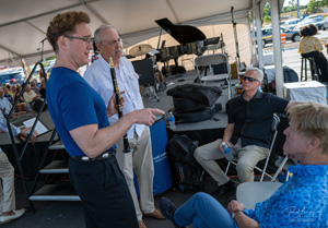 BELOW LEFT: Clarinetist Dave Bennett confering with his band Jeff Kressler, Pete Siers and Ed Fedewa before their performance on the Open Air Stage